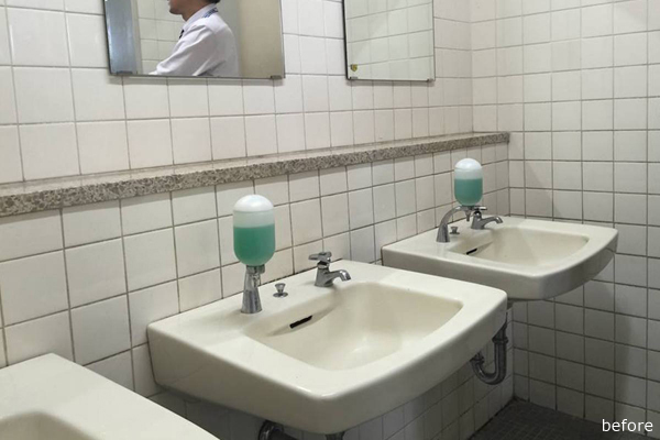 これに対し、非接触センサー式便器とセンサー式石鹸手洗い、暖房便座、視線制御を徹底した入口扉の撤去、入口前の荷物置場、明るく清潔感ある乾式仕上げを共通仕様とし、中高それぞれ4フロア・男女計16箇所を、夏期休暇を利用した2年計画で段階的に改修した。